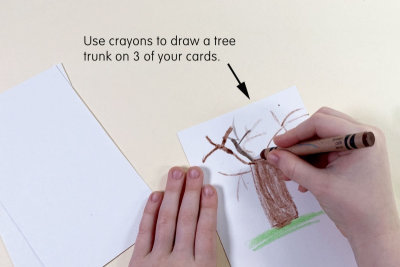 - Use crayons to draw the same tree trunk on 3 of your cards.